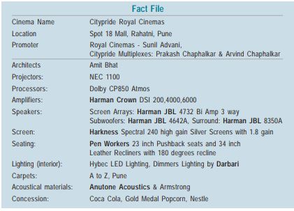 Citypride Multiplexes, a whollyowned subsidiary of Chaphalkar Brothers Pune, unveils Citypride Royal Cinemas, a 4-screen property in association with Royal Cinemas promoted by Sunil Advani and Hargobind Tejwani. The multiplex will be launched in the month of December 2015 at Spot 18 Mall, Rahatani-Pune. The Citypride brand is one of the very few family-owned multiplex chains with its roots dating back to 1939 when the first singlescreen cinema of the group was opened.It is located at the plush Spot 18 Mall in Rahatani, one of the most sought after commercial localities in Pune with excellent connectivity to Pimpri Chinchwad (PCMC) area, which is hailed as one of the most booming infrastructure developments in Maharashtra and Hinjewadi IT city.the third biggest IT hub in India after Bangalore and Hyderabad. This location advantage will help cater a large catchment area with majority of IT professionals with good spending capacity. The average expectancy of footfalls at this cinema would be around 2000 people per day on weekdays and 4500-5000 people per day on weekends.